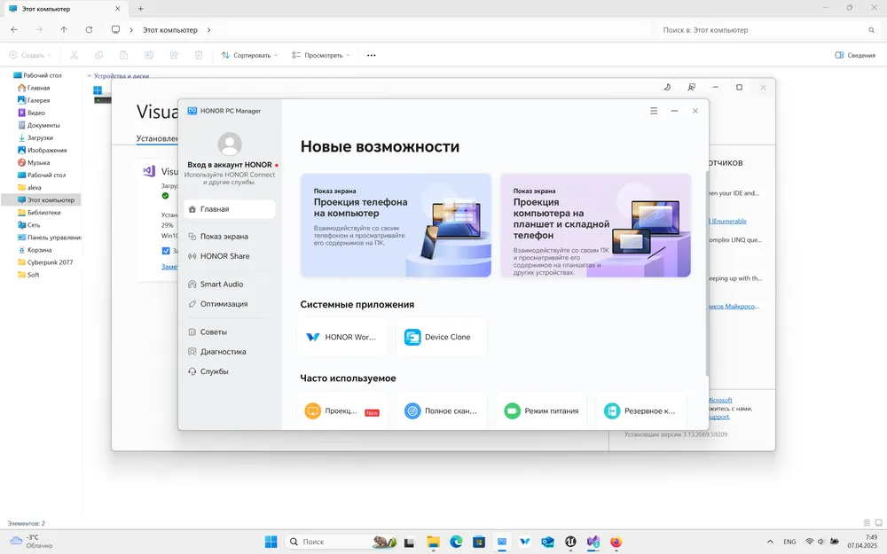 Как у других ноутбуков от Honor, у HONOR MagicBook X16 Plus есть встроенный в операционную систему (Windows 11) менеджер программ — Honor PC Manager. Помимо общих функций по обновлениям и техподдержке, он может переключать компьютер в производительный режим (только при питании от сети) и соединять с мобильными устройствами Honor (например, для быстрой передачи файлов со смартфона).