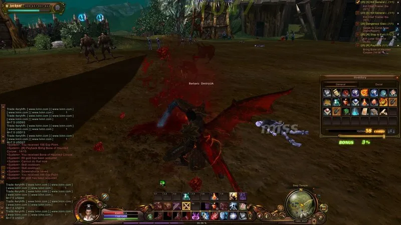 Джекпот – это своеобразная помощь при прокачке. По мере выполнения заданий выдаются очки джекпота. Нужно выбрать все сразу, а можно только одну из четырех вещей – золото, опыт, баф или предмет, и нажать на рычаг. Когда выбираешь золото, есть шанс сорвать 1% от общего джекпота (его сумма отображается вверху), а это порядка 700к-1кк – суммы, которой хватит, чтобы полностью одеться в синюю броню, заточить ее и еще добрый десяток уровней жить припеваючи.