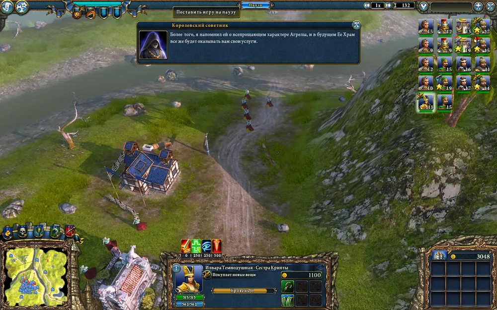 Опять же такая миссия была в М1. Тут все проще имхо. Много Героев не лепим как и много грейдов. Мне хватило скаутов, послушниц, разбойниц и воинов. Ну и пара лордов в частности жрица Крипты и Разбойница. Вобще разбойница лорд полезная штука и дешевая. Быстренько сносим ближайшие гильдии разбойниц, что даст денег на фаст развитие. Далее не забываем про торговые посты. В святые земли к элементалям не суемся. В правом верхнем углу важный караван везет 10к. Его надо про экскортить на юг. Так что готовим бабки на флаг защиты. Добиваем оставшиеся гильдии разбойниц и копим оставшиеся деньги. Надо 35к за 35 дней. За каждую гильдию по 5к, за караван 10к...в целом все просто. Не забываем про артефакт доставшийся от короля крысс.