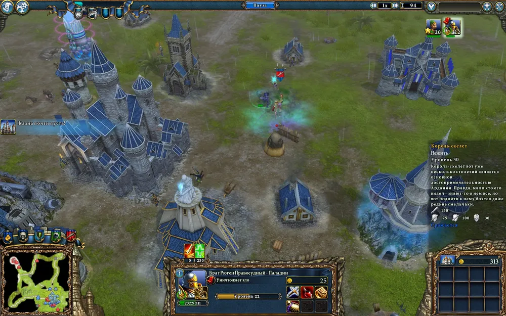 Очень очень напряжно. Король скелетов выкорчовывает всех и вся. Советую побыстрее добраться до склепа. Дальше нужен хороший танк желательно из лордов. Особо карту не успел зачистить. Скелет сам к вам приходит на 81 день. Башни не помогут он их сносит с пары ударов. Какие ещё могут быть варианты не придумал...пытался многими способами через сейв. Смог тока при помощи паладина лорда 22 левла, который стоил мне 10500 если не изменяет память. В конце паладин эпично махался со скелетом 1 на 1 , когда у него примерно осталось где то 12к хп. Лечил его при помощи заклинания. Ну и скаут был не докаченный...При таком раскладе советую башенками обезопасить свои владения т.к. бой долгий и герои будут заняты скелетом либо убиты. Получаем очень полезный артефакт.
