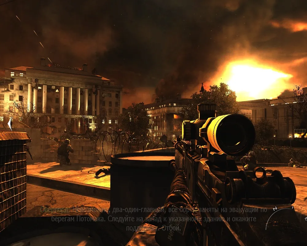 В игре есть атмосфера. Она намного сильнее, намного лучше и детальней, чем во всех прошлых частях вместе взятых. Уровень в Припяти из Modern Warfare меркнет на фоне любого из уровней Вашингтоне Modern Warfare 2. Да и менее проработанные места действия вроде Бразилии или Афганистана, они менее проработаны только по отношению Вашингтона. Modern Warfare просто-напросто образец геймдизайна для современных шутеров. Ни больше, не меньше. И вот эта вся атмосфера, она с лёгкостью вытягивает игру, и уже не хочется думать о нелогичности действий русских и странности всего происходящего вокруг. Хочется просто узнать, что произойдёт дальше.
