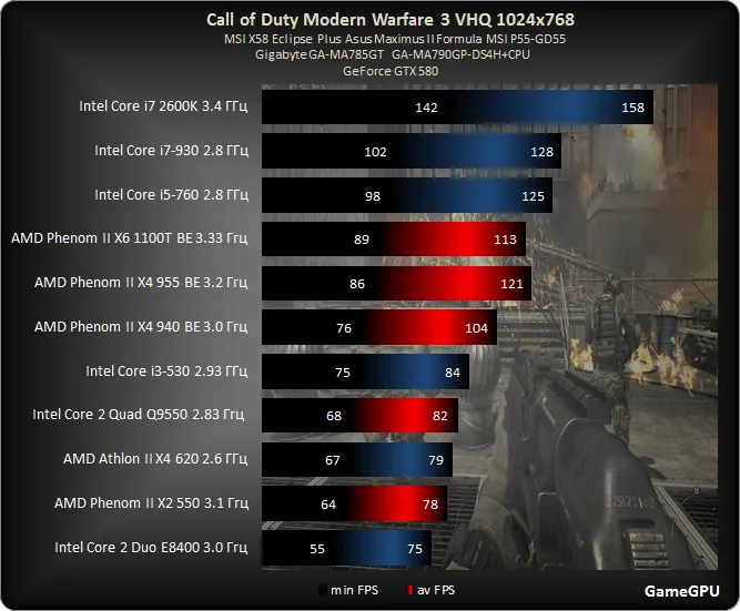 Как и положено, Call of Duty Modern Warfare 3, основанная на движке пятилетней давности вполне лояльно относится к требованиям потребления ресурсов ЦП. Но помимо этого производительность неплохо масштабируется при использовании 4-х ядерных процессоров, которые показывает в игре беспрецедентную производительность.