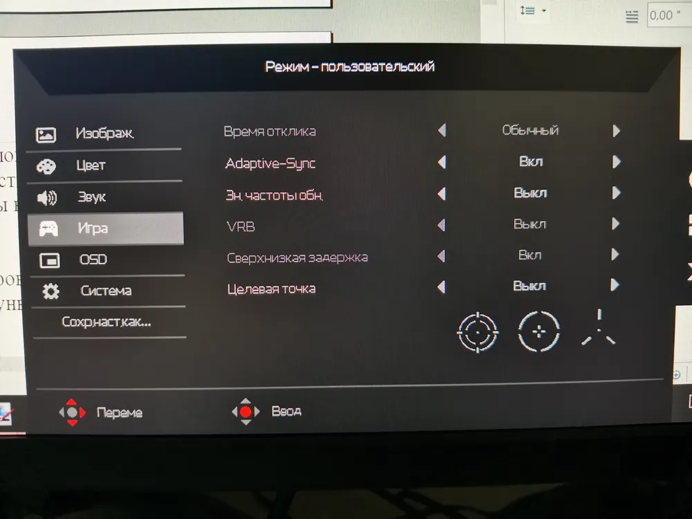 Главный раздел для любого геймера: Gaming (Игра). Здесь можно настроить разгон матрицы, активировать один из подрежимов VRB или технологии Adaptive-Sync (для работы Free-Sync и G-Sync) и Ultra-Low Latency (снижение инпут-лага), поставить отображение FPS (многие для этого включают программу Fraps, здесь предусмотрена своя аппаратная функция), а также включить и настроить несколько жульническую штуку –— наэкранный прицел.
