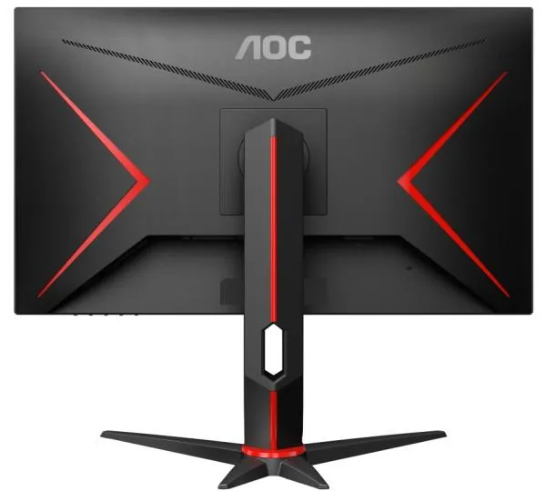 На обратной стороне монитора можно увидеть аккуратно сделанное отверстие для вентиляции. По бокам расположены красные вставки, сверху поместился серебристый логотип производителя. Внизу же располагаются порты и разъемы – у монитора четыре порта USB, два HDMI, два аудиопорта, один порт VGA, один DP и один Type-B.