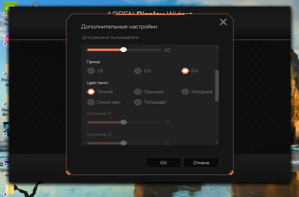 Приятно, что как и у мониторов Acer, у AOPEN Fire Legend есть утилита для настройки. Яркость, контраст, цвета и остальные параметры изображения можно настроить с компьютера вместо того, чтобы лезть за монитор — как и у Acer, кнопки для ручной настройки расположены в нижнем правом углу монитора с задней стороны.
