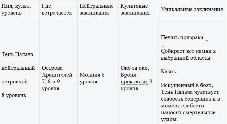 Здоровье: 1000, Мана:750 ,Урон: 70, Броня: 200, Удача: Ярость: 12, Блок: 12. Использует заклинания.
