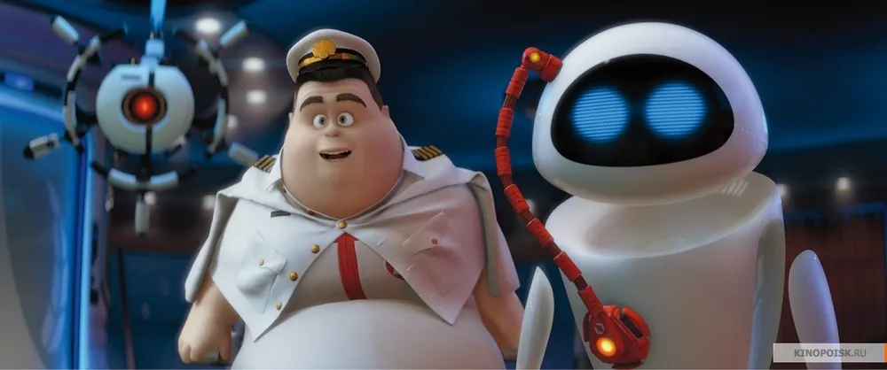 Не долго думая ВАЛЛ-И приказывает ручному таракану сидеть и ждать его, он кидается на помощь к ЕВЕ и улетает на космическом корабле в неизвестном направлении. После относительно короткого и красивого путешествия вся компания прибывает на космический корабль - тот самый AXIOM. Там ЕВУ срочно транспортируют в неизвестном направлении и ВАЛЛ-И пытаясь ее догнать обнаруживает что на корабле огромное количество роботов и людей. Но люди какие-то странные. Толстые, оплывшие... В общем робота-исследователя доставляют на капитанский мостик и докладывают капитану о том что найден объект способный к фотосинтезу. Когда вызывают капитана становиться видно почему все такие оплывшие и ленивые. Но как оказалось автопилот не согласен с решением капитана вернуться на Землю и берет того в плен. ТИем временем ЕВА, ВАЛЛ-И и компания сумашедших дефектных роботов пытаются доставить росток по назначению.