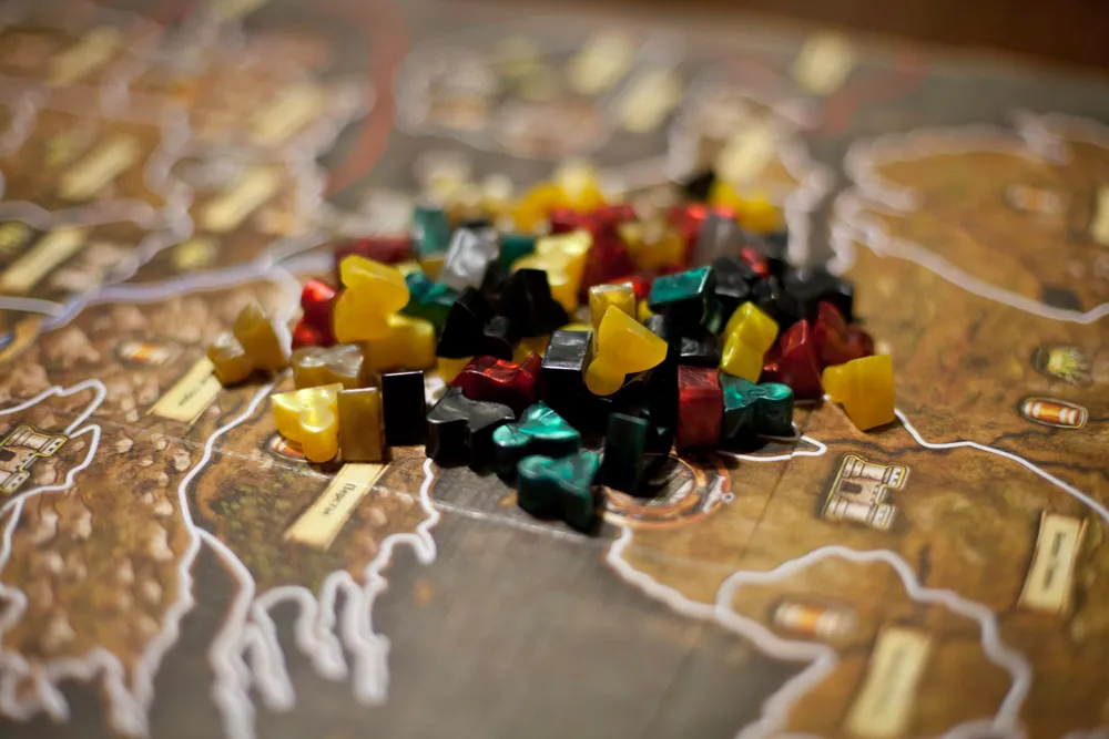 Сразу можно сказать – при должном обращении многочисленные компоненты игры рассчитаны на долгое использование. Материалы плотные, красочный слой не истирается, а фишки из тяжелой и прохладной пластмассы достаточно крупные и внятные, но не мешают своими размерами их расставлять. В комплекте имеется игровое поле в виде карты мира, разделенной на зоны с надписанными городами. Смотреть на нее – одно удовольствие (Если что - у меня издание от Hobbyworld).