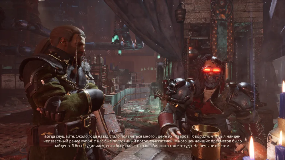 В шутерах «беги-стреляй», типа Necromunda: Hired Gun, большое достижение получить озвучку для главного героя, особенно когда это инди-проект. Наёмник, за которого мы играем (или наемница – здесь можно выбрать вашего протеже) общается с временными союзниками, периодически что-то комментирует и вообще, показывает циничный характер. Заход по «очеловечиванию» ГГ (главного героя), в общем-то, хороший – однако подкрепления, в виде сюжета, не происходит. Проект явно рассчитан на фанатов вселенной, потому что нам в лицо периодически бросают названия разных фракций, локаций и имен, без объяснения. Ладно хоть перед миссией мы получаем небольшие поясняющие комментарии– и на том спасибо. Судьба мелькающих перед экраном персонажей, с которыми наемник ведет беседы, безразлична – большинство из них мы видим один раз, и вообще непонятно: кто это и для каких целей нам показывают кат-сцены, ведь никакого эффекта, кроме торможения геймплея нет. А в конце состоится поворот в духе «вот это поворот!» и разоблачающий диалог, из которого, по замыслу разработчиков, все становится ясно. Мне же стало ясно, что несмотря на циничность и прокуренный голос, герой застыл в возрасте мальчика на побегушках, которым вертят как хотят.