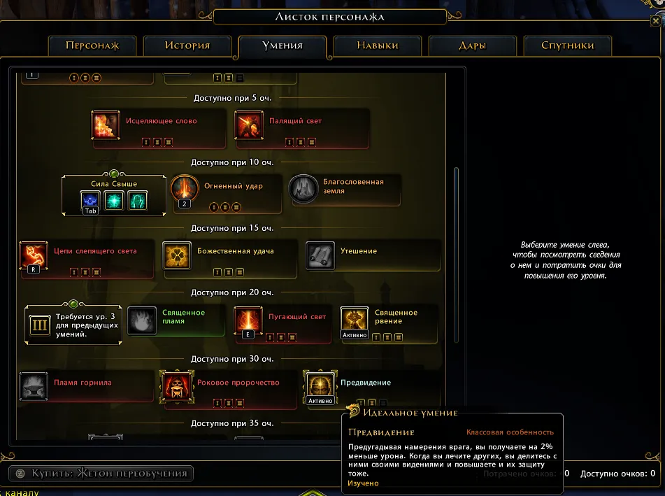 Хочется сразу развеять миф о том, что в NWO мало умений у персонажа – это далеко не так, на самом деле умений у персонажа много, и их, как и в классическом NWN все выучить нельзя, просто набор активных умений ограничен панелью действий персонажа: мы можем выбрать 3 активных умения, 2 «свободных» умения (аля автоатака), 2 ежедневных умения (мощные умения, для активации которых нужны очки действий ОД), и 2 пассивных умения/ауры, которые дают определенные бонусы персонажу или всей группе. В итоге правильная комбинация навыков на панели в NWO тоже является одним из аспектов построения «билда» персонажа, и найти ту самую золотую середину или идеальную комбинацию для ПВП/ПВЕ/Соло/Групповой игры весьма непросто.