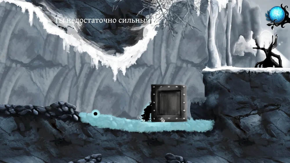 В данном случае - голубой. Это лед. По нему мы прыгаем дальше, двигаем тяжелые вещи или помогаем врагам подскользнуться на краю обрыва.