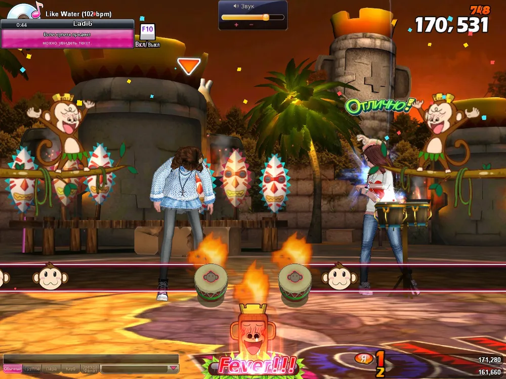 В "Бонго", как можно понять из названия, нужно играть на бонгах. На данный момент для этого режима нам доступно всего 8 песен со скоростью от 92 до 160 bpm. Локация под этот режим есть только одна - "Тайна острова обезьян", и выполнена она в подобающем стиле - джунгли, ритуальные костры и...море обезьянок.