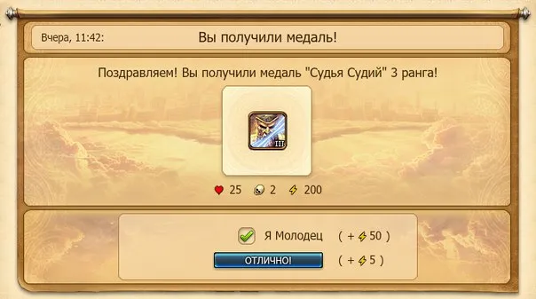 Не только за само уведомление Вы получаете 5 энергии, но и за публикацию «своего счастья» при получении медали в соц. сети. Вот только за это дают уже 50 энергии! Для высоких уровней - это не сильно принципиально, ведь большинство медалек уже заработано, но на малых уровнях - это произвело фурор. Энергия - это именно то, что сдерживало недонатов, а теперь – флаг в руки, и играть дальше)))