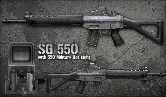 SG-550 - штурмовая винтовка швейцарского производства. По сравнению с другими винтовками имеет большой вес, высокую надежность и точность стрельбы.