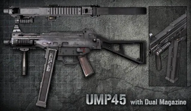 UMP45 Ext. - пистолет-пулемет, предназначенный для вооружения спецподразделений и армии. По сравнению с MP5K имеет большую пробивную мощь за счет использования патронов калибра .45ACP. Одной из особенностей данной модели является спаренный магазин.