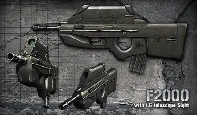 F2000 - штурмовая винтовка бельгийского производства. Сочетает в себе хорошую скорострельность и дальность ведения огня. Винтовка легка в обращении и оснащена оптическим прицелом.