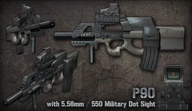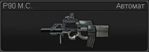 P90 M.C. - модификация бельгийского автомата P90 под натовский патрон калибра 5,56. По сравнению со своим предшественником обладает большей огневой мощью и дальностью ведения боя. Автомат оснащен коллиматорным прицелом с лазерным целеуказателем.