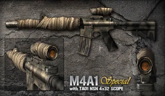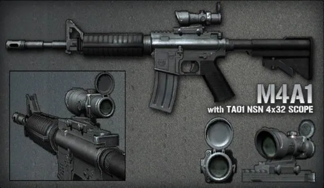 M4A1 - штурмовая винтовка, созданная фирмой Colt на базе винтовок семейства AR15 и M16. На планку Пикатинни установлен оптический прицел, при использовании которого можно вести огонь короткими очередями по 3 патрона.