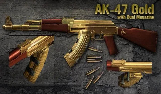 Особенность: спаренный магазин; добавляет уверенности в своих силах (кажется, что с золотым калашом порвешь всех)