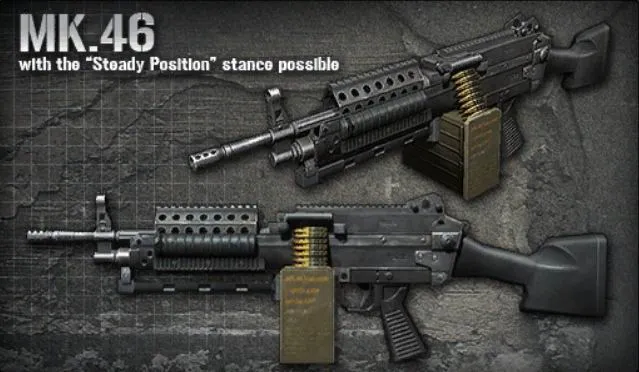 MK.46 Ext. - пулемет калибра 5.56x45 мм производства Fabrique National (Бельгия). Заслужил популярность за счет высокой мобильности вкупе с огневой мощью, что заметно превосходит другие ручные пулеметы.