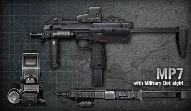 MP7 Ext. - пистолет-пулемет от немецкой фирмы H&K. По кучности стрельбы превосходит многие другие пистолеты-пулеметы подобного размера. Незаменим в закрытых пространствах за счет высокой маневренности. Оснащен коллиматорным прицелом.