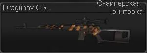 Dragunov CG. - огневая мощь базовой модели доведена в этой модификации до максимальных показателей. Увеличенный боезапас повышает шансы на умерщвление противника. И, наконец, защитный цвет сохранит стрелка в невидимости лучше всего.