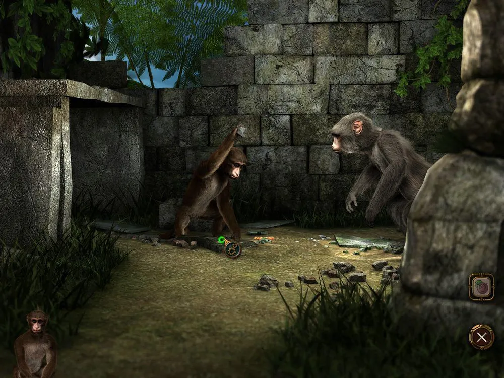 То есть, вы уже четко уяснили, какое главное нововведение сиквела – если в первой части Джеп был лишь дополнительной «вещью» в инвентаре (точь-в-точь как летучая мышь Фродерик из A Vampyre Story), то в RtMI 2 наша мартышка уже полноценный и самостоятельный персонаж. Поиграть дают попеременно то Миной, то ее хвостатым и мохнатым другом. Соответственно, задачки тоже строго делятся на две условные категории: те, что посложнее – для нашей «Индианы Джонс в юбке», а всякие ответственные мероприятия – ну, там, спинку почесать, блох поискать у одной очень симпатичной обезьянки, припасти фруктов, или муравьев наловить для важного дела – это уже строго для Джепа.