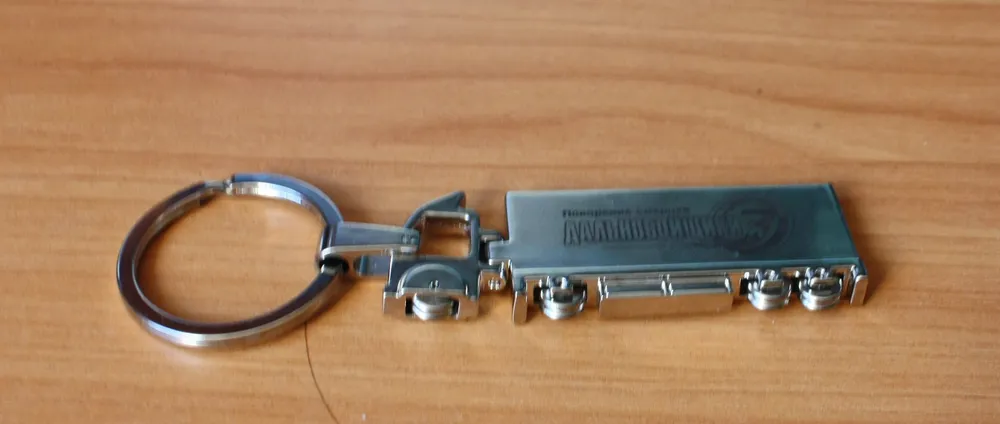 Длина его - 7 см без учета кольца. Довольно тяжелый. Колеса крутятся!