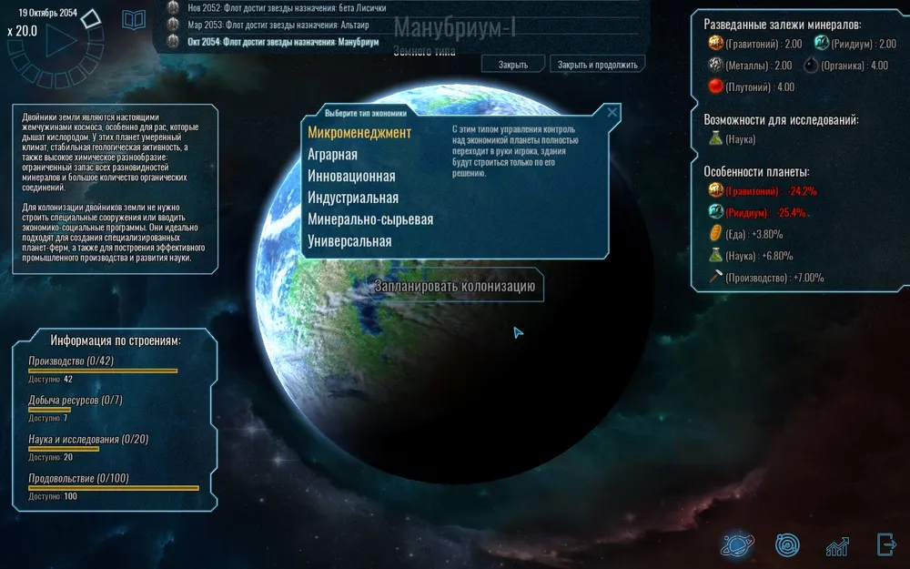 Колонизируя планеты, можно назначить путь её развития; будут ли там строиться заводы или научные лаборатории, решать вам. Впрочем, можно не мудрствовать и поставить универсальный режим, где все будет сбалансировано, а можно и строить все в ручную, но когда количество планет превышает пару десятков это как минимум долго.
