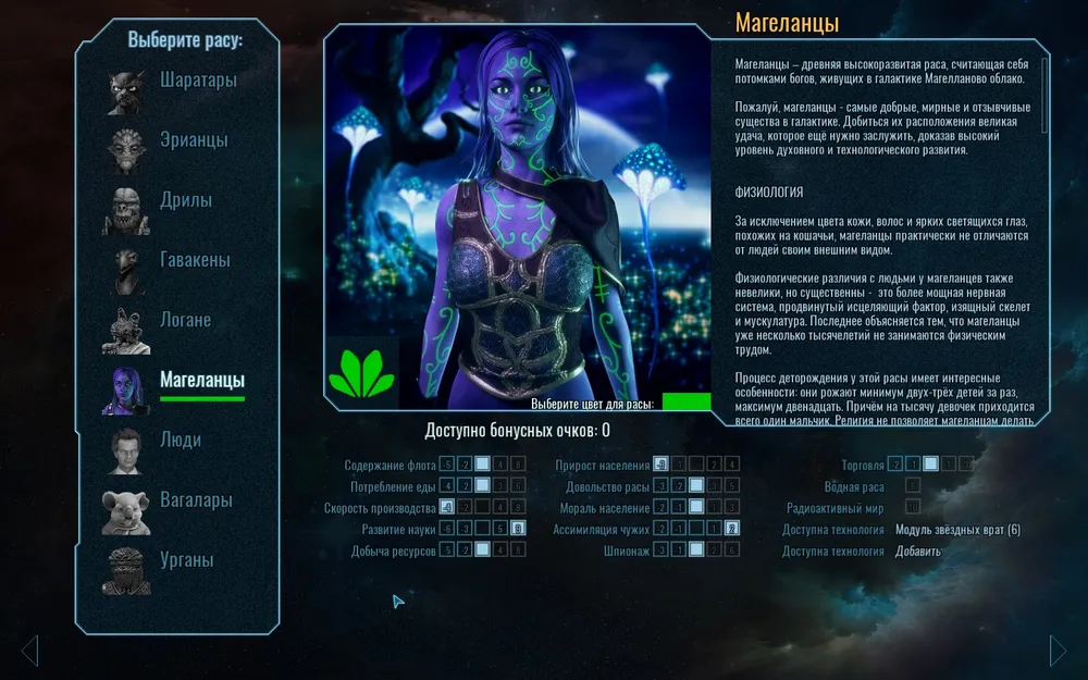 Далее мы выбираем расу, которых в игре 9. У каждой расы свои особенности и свои корабли, что дает возможность поэкспериментировать. Также можно настроить определенные бонусы расы по своему усмотрению.