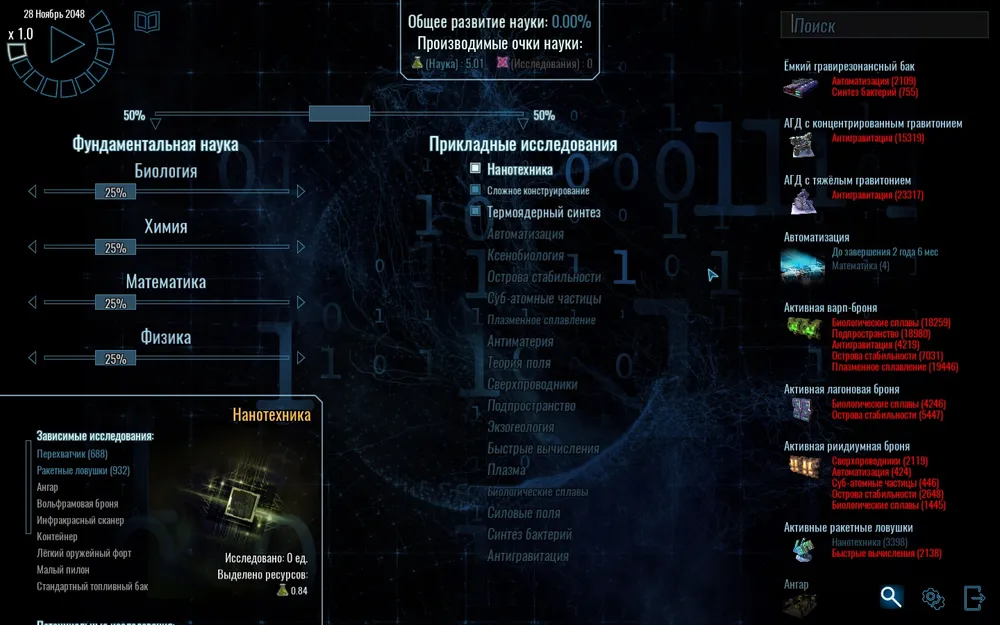 Наука. Количество научных разработок в игре очень велико, велико настолько, что в игре есть даже поисковик по открытиям. Наука позволяет открывать новые корабли, новые вооружения, двигатели, генераторы и прочее, что позволит вам сконструировать самый непобедимый корабль в галактике, позволит освоить новые планеты (это одно из новшеств, теперь, чтобы колонизировать большинство планет, потребуются технологии) и поднять производительность планет.
