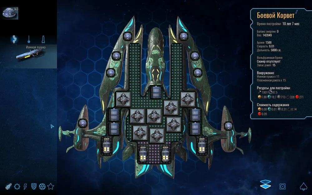 Конструктор кораблей - это главное, что есть в этой игре, по моему мнению. Корпус корабля вам дается изначально, а вот начинку вы полностью выбираете и устанавливаете по своему усмотрению, это интересно, уверяю) А потом вы можете опробовать свое детище в бою. Но не стоит забывать, что чем сложнее вы сделаете корабль, тем дольше он будет производиться и будет требовать больше ресурсов на свое содержание; может случиться так, что на постройку одного корабля уйдут ресурсы всей вашей империи, если она не достаточно велика.