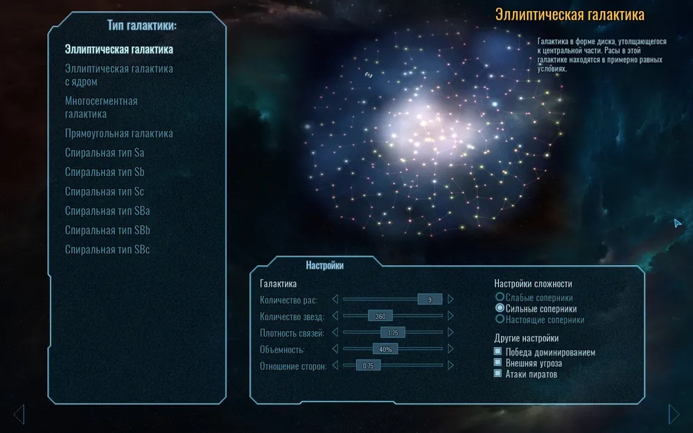 Игра начинается с того, что мы выбираем "поле боя", а им является целая галактика, и мы можем настроить её по своему желанию: силу и количество противников, количество звезд, объемность или плоскость, вытянутость или шарообразность, также можно задать условия победы, одно из которых - победа над неким врагом галактических масштабов, который появится позднее. А также можно добавить или убрать появления пиратов.