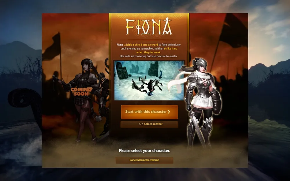 Сначала нам предлагают выбрать класс персонажа которым мы будем играть. Как видно на скрине, всего будет пять классов, доступны из которых пока что только два и один намечается в ближайшем будущем. Можно предположить, что следующими классами будут: волшебница, друид и нечто вроде рыцаря.