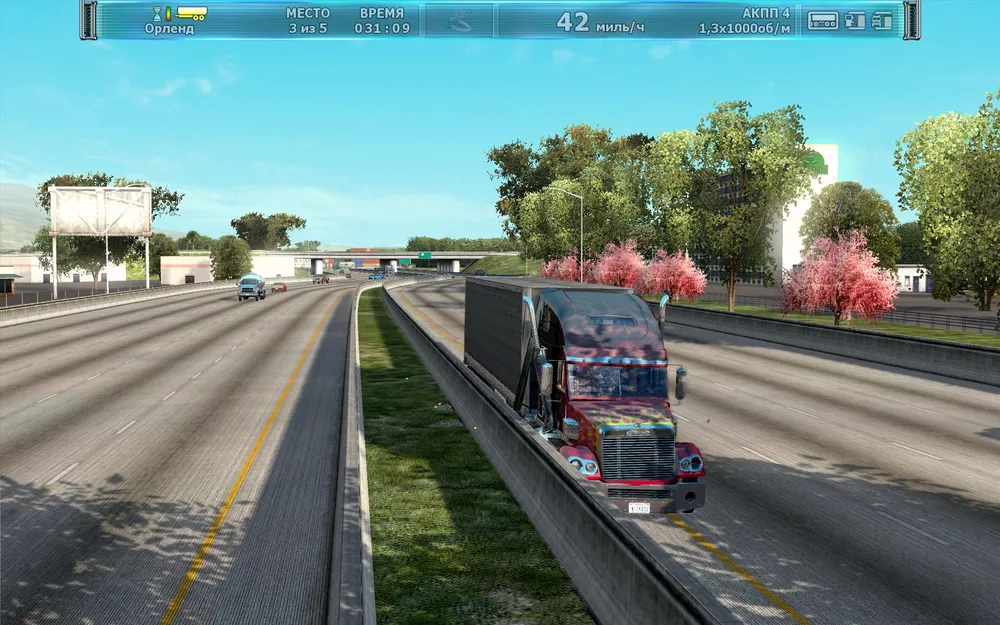 Взяв груз, мы погружаемся в ту самую романтику дальнобойщика: только трак, дорога и старое-доброе кантри, доносящееся из колонок автомагнитолы...