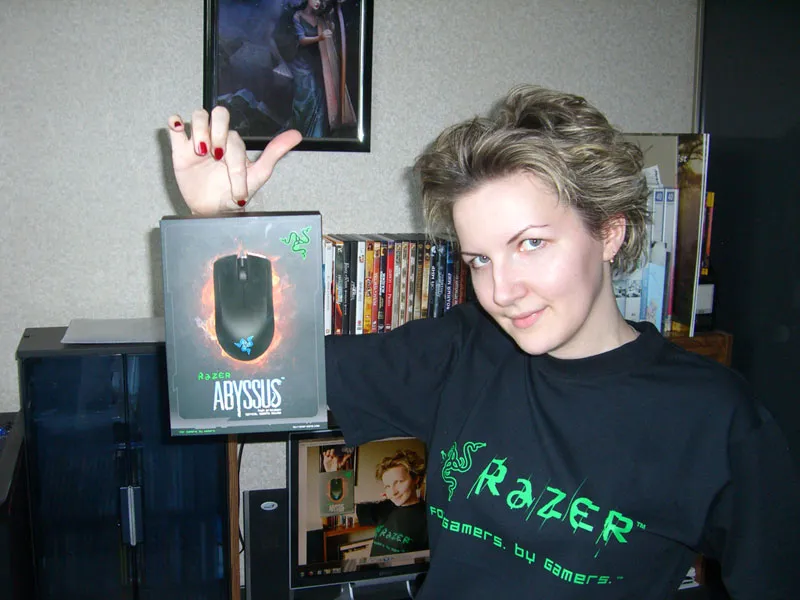 Наталья заулыбалась и испарилась, вернувшись через пару минут с мышью, чашкой и футболкой. А еще орудием пытки: очень многопиксельной камерой, которая ненавидеть меня будет примерно на 20 мегапикселей сильнее, чем мой родной фотик. Также в комнате материализовался фотограф, который должен был запечатлеть момент единства меня и мыши Razer во имя счастья всех геймеров планеты. По замыслу я должна была посылать в камеру флюиды восторга, улыбаясь во все свои 32 не особо ровных зуба (правда-правда, у меня был в детстве оч страшный стоматолог! О_О). Не, восторг у меня по ходу был, просто я оч сомневаюсь, что он лучился правильно. Полагаю, что в итоге на камеру злобно глумился лохматый хобгоблин, которому просто было хорошо от мысли, что он урвал халявную razer'овскую мышь. Именно поэтому мне заранее страшно за фотки, а еще за людей, которые их увидят..