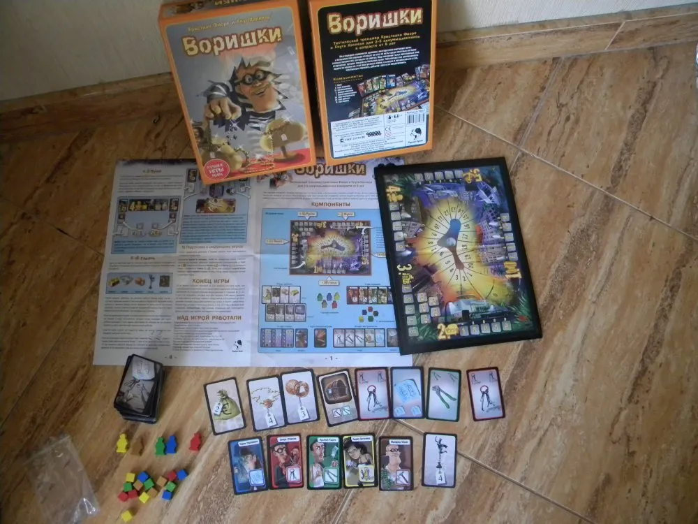 "Воришки". Исполнение также на уровне - красивые карточки, плотное игровое поле, которое не растреплется за какой-то месяц, и милые деревянные фишки, выглядящие немного примитивно но весело.