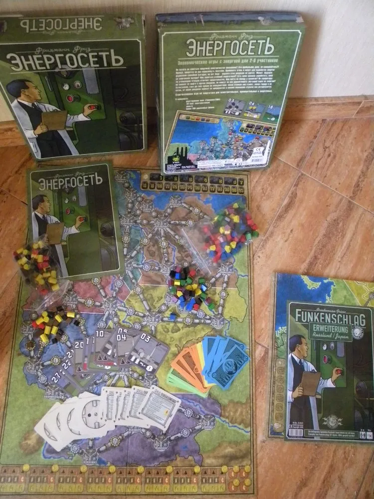 Энергосеть с дополнением. Самая большая и тяжелая коробка, вызвавшая у меня удивление - на картинках она выглядела куда меньше. Картонное поле, цветные деревянные элементы, вызывающие желание удариться в детство и поиграть в кубики, и красочные карточки, только "деньги" односторонние и довольно мягкие. Думаю, стоит закатать их в скотч. Дополнение представляет собой еще две карты - России и Японии, правда, правила и объяснения к ним представлены на немецком языке. Зато обозначения на карте - на немецком и русском. В общем - красота.