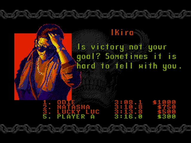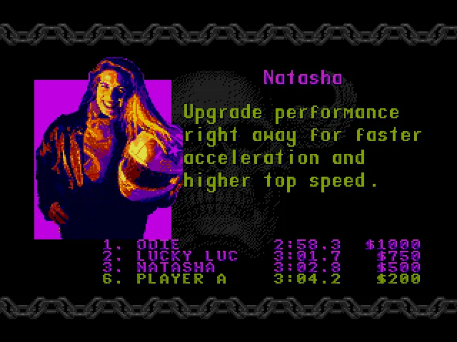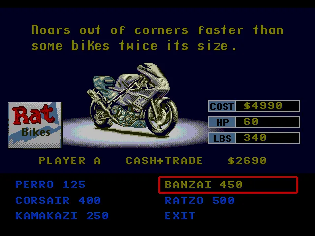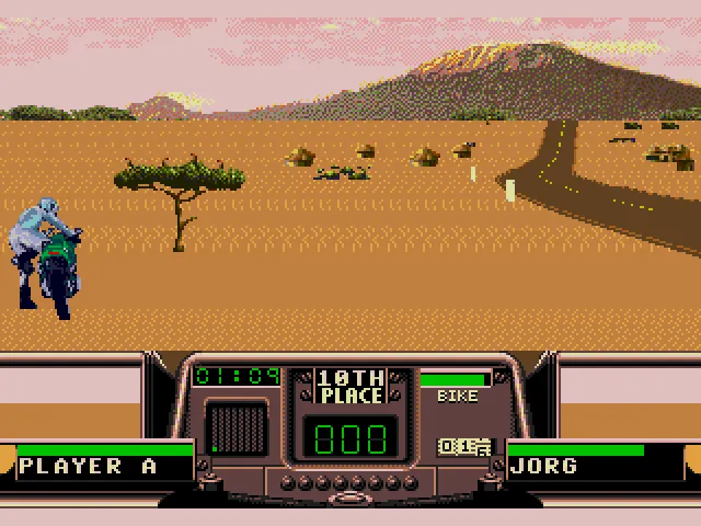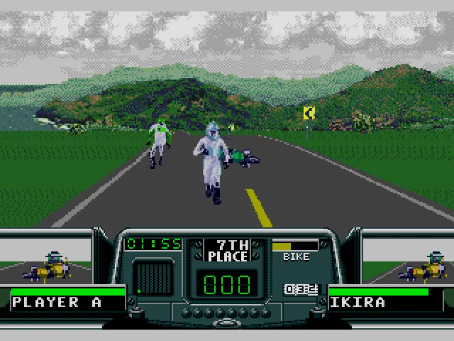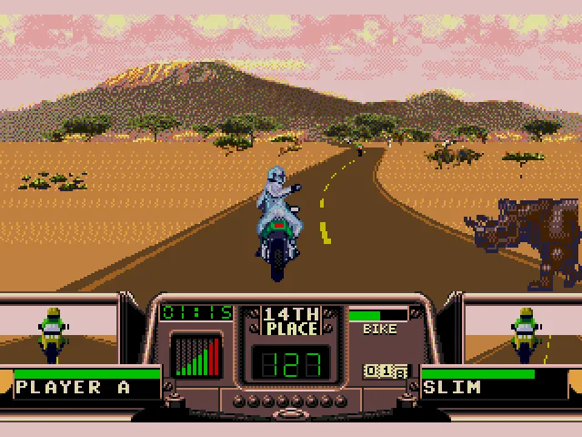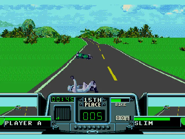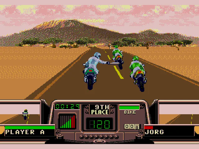 В RR есть своя изюминка. В том числе и в ситуации, когда у вас заканчиваются наличные для починки собственного байка, после очередного заезда. Вы переходите в разряд “бегущего человека”, который абсолютно не владеет транспортным средством и цель которого поймать владельца байка, сбить его кулаком и оседлать его железного коня, чтобы снова быть в игре и иметь шанс выиграть гонку!