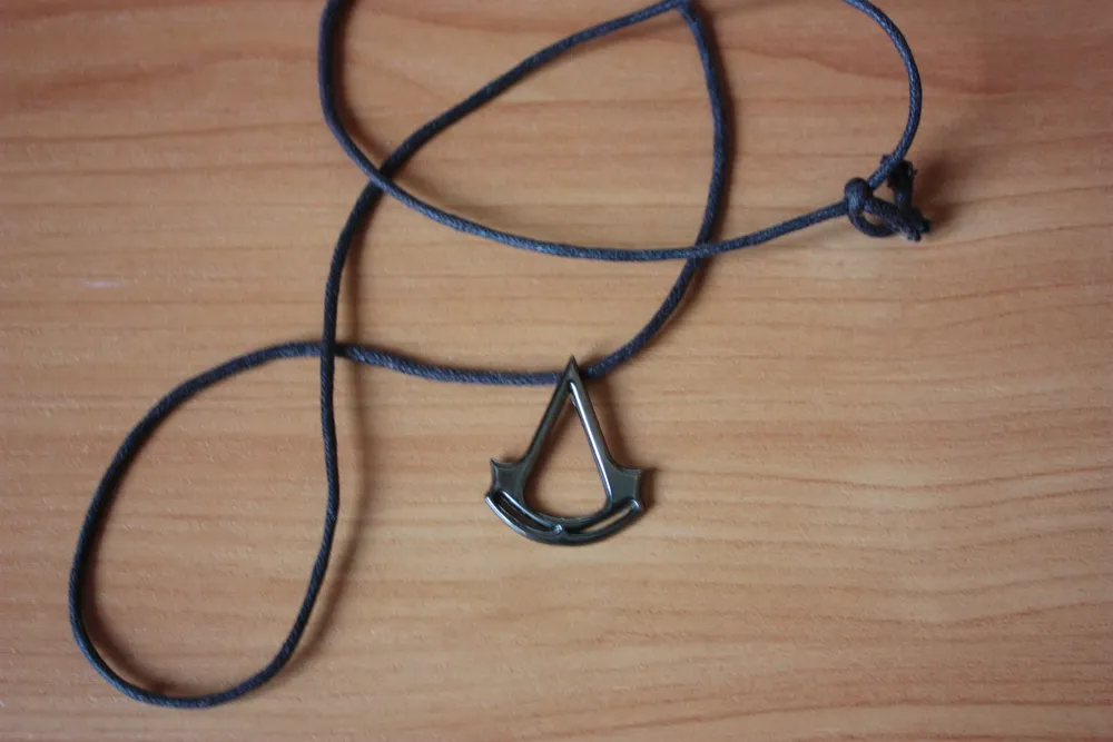 Следующий элемент – амулет ассасина. Маленький, железный, на кожаном ремешке. Кожаный ремешок теперь видно лучше. Вот такой: