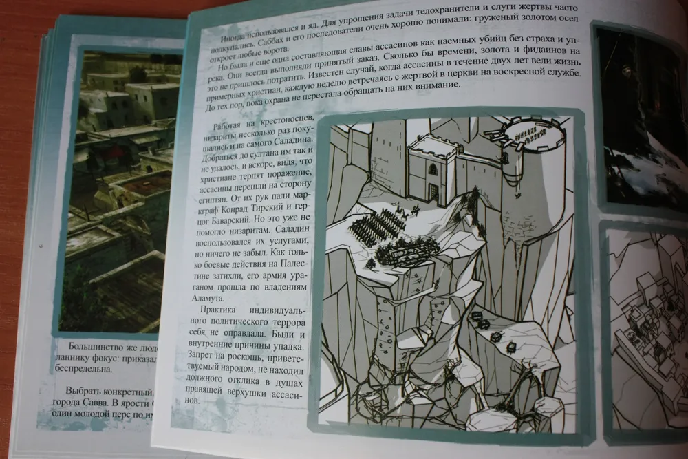 Теперь по элементам. Сначала – артбук в мягкой обложке на 50 страниц с артами игры и историей братства ассасинов (к слову, эту историю я сдавал как реферат по истории в институте^^). Материалы предоставлены журналом ”Мир Фантастики”. Единственная проблема в нем - страницы вываливаются: