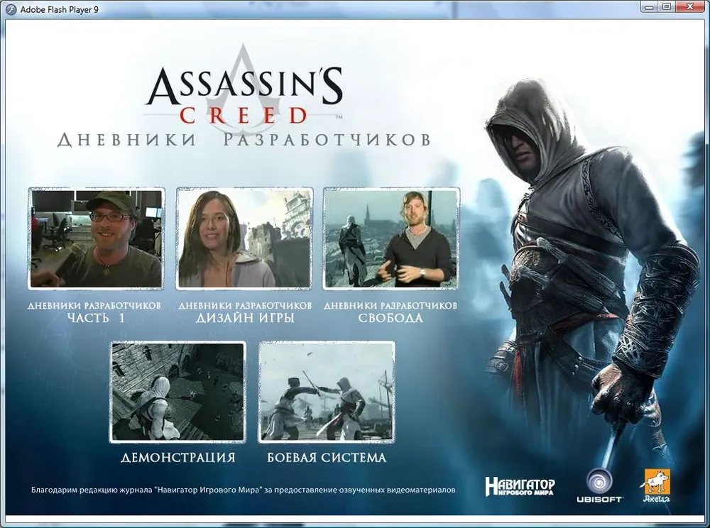 Еще в коллекционке есть бонусный диск, пафосно названный “Дневники разработчиков”. Видеоматериалы предоставлены журналом “Навигатор Игрового Мира”. Вот такой флэш-интерфейс: