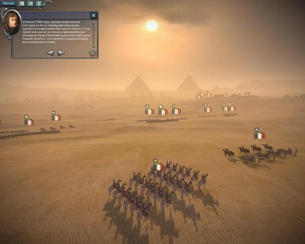 Далее, в ходе пребывания на египетских вакациях армия Наполеона преображается: босоту сменяют регулярные войска. Помощь от метрополии, однако, не поступает – британский флот под управлением адмирала Нельсона блокирует все морские пути; поэтому, стиснув зубы, приходится приспосабливаться к новым условиям: формируем отряды из туземцев (каждый – в чалме, бороде и шароварах) и учимся ездить на верблюдах, стараясь не думать о том, как оно выглядит со стороны. Наконец, в последней кампании мы руководим знаменитой Великой армией – той самой, что в течение десяти лет несла на острие штыка мир и процветание народам Европы.