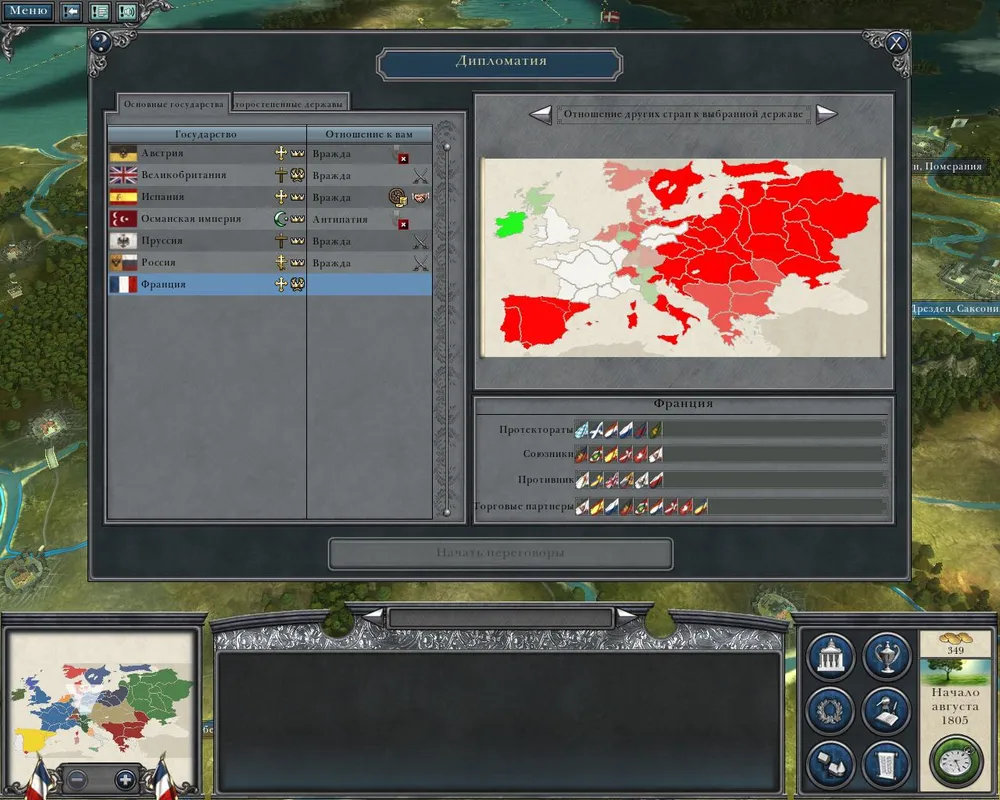 Несмотря на то что все события новой Total War крутятся вокруг города Парижа и корсиканца-малорослика, мы запросто можем сыграть и за его злейших противников – Великобританию, Пруссию, Австрию или Россию. Цели у них не столь амбициозные, не чета устремлениям императора французов, но вполне сгодятся, чтобы пощекотать орган, ответственный за национальную гордость. Например, российский император никак не может простить шведского лихоимства, мечтает оттяпать обратно некогда утраченную Финляндию, а затем задать перца распоясавшимся османам, прибрав к рукам Молдавию и Бессарабию. Как тут не начать новую кампанию? Призовем, понимаешь, турка и шведа к ответу. Далее все государственные мужи неизбежно друг с другом ссорятся, частично мирятся, сообща мутузят крайних, а после дают дружного пинка под амбициозный корсиканский зад.