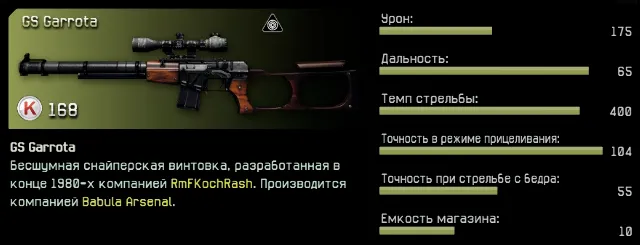 Описание в игре говорит нам, что GS Garrota - это бесшумная снайперская винтовка, разработанная в конце 1980-х годах компанией RmFKochRash. Производится компанией Babula Arsenal. Думаю, это нам мало чего говорит, кроме того, что она бесшумная. И да, одно из ее основных отличий от других похожих винтовок - тихий звук выстрела, который не даст сразу же сориентироваться врагу и выдать ваше местонахождение, что существенно увеличит ваше время жизни и возможности.