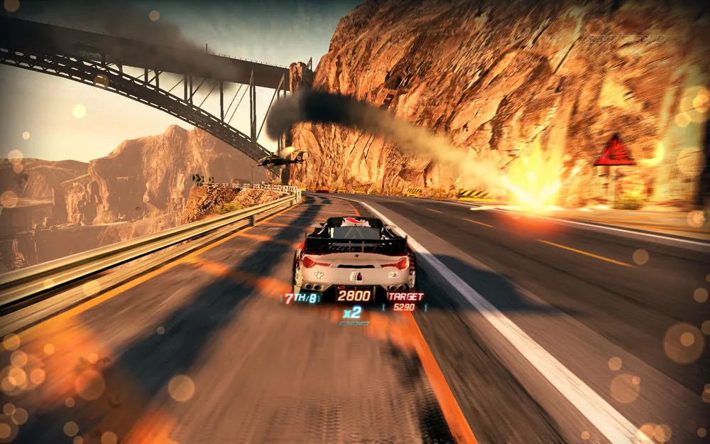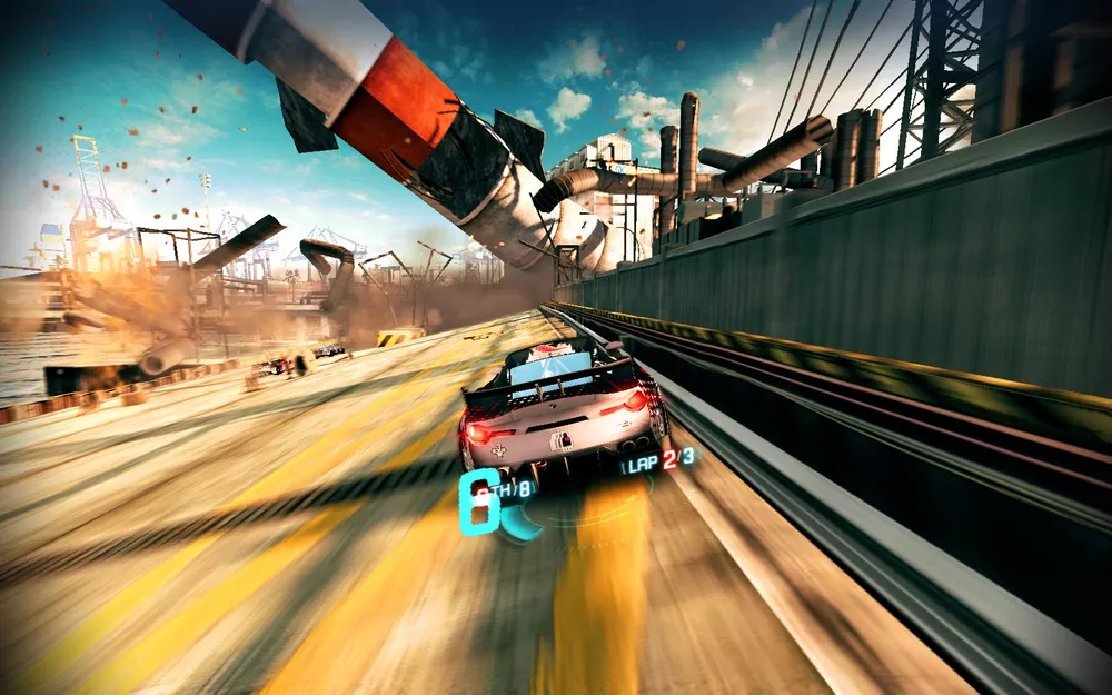 Но какое телешоу без зрелищности? Все гоночные трассы методично обставлены взрывоопасными объектами, детонировать которые вы можете только после заполнения шкалы, выполняя зрелищные действия, типа управляемых заносов. И вот вы наконец нажимаете клавишу, отвечающую за кабум, и огромный билборд сталкивается с постамента неведомой силой и падает прямо на противника. Буря оваций, вы проезжаете мимо огней и софитов и тут оппонент, догоняющий сзади, активирует еще одну взрывную точку и уже ваша машина агонизирует, столкнувшись с неведомо откуда выкатившимся горящим грузовиком – и такие ситуации генерируются тысячами. Особенно прекрасны взрывы, которые меняют расстановку почти всего уровня, руша мосты и сдвигая с насиженных мест огромные корабли.