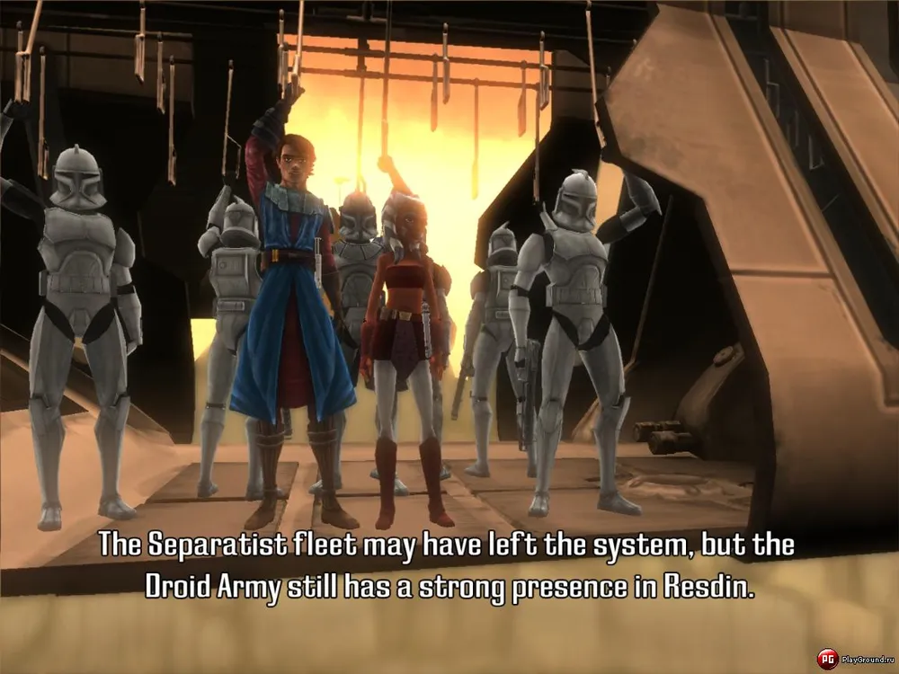 Откинувшись на спинку кресла, смотреть наRepublic Heroesво время межмиссионных брифингов очень приятно. Люди, видевшие первый сезон Star Wars: The Clone Wars, тут же начнут вспоминать, как наш бравый Энакин Скайуокер использовал силу строго по заветам мастера Йоды и раздавал пинки дроидам строго по заветам Оби-Вана Кеноби. Актеры на озвучке задействованы те же, что и в анимационной драме. С хронологической частью расстыковок нет - Republic Heroes лишь освещает «не вошедшее» в 22 серии, нигде не привирая или переиначивая. Честь и хвала – любоваться кат-сценами и узнавать, что творилось во время клинических битв с другими персонажами, очень интересно. Любоваться – интересно. Играть – ни разу.