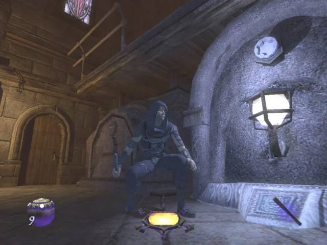Сходство Thief 3 с молодым и наглым конкурентом в лице Splinter Cell не ограничивается видом от третьего лица. Гаррет, как и Сэмми Фишер, также обзавелся зеленым глазом, правда, только одним. Вместо правого ока в голову главгероя отныне вмонтировано хитрое устройство, которое позволяет видеть в темноте (увы, не очень хорошо), а также работает как портативный бинокль. Лицезреть процесс выдвижения чудо-гаджета из глазницы авторы, к сожалению, не позволяют — камера автоматически переходит в вид от первого лица. Зато зеленая лампочка в темном углу подозрительно напоминает огоньки московских таксистов на допотопных “Волгах”. Продираясь сквозь мрачные подземелья, Гаррету периодически хочется бросить: “Эй, шеф, два счетчика!”