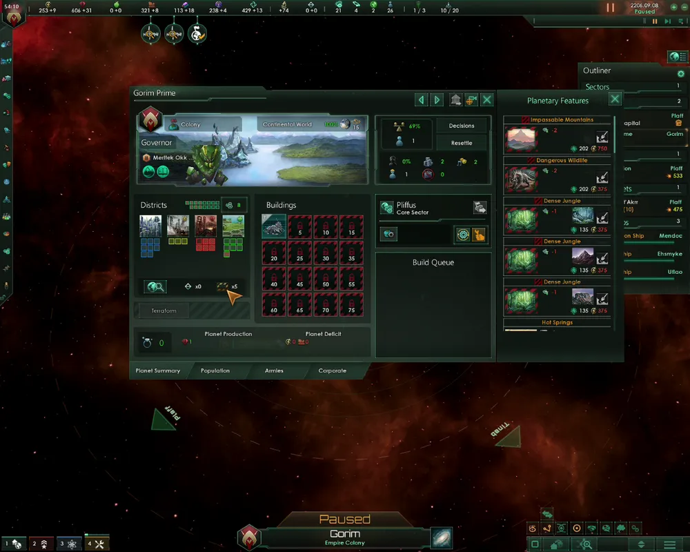 А вот где Stellaris по-настоящему развернулась — это менеджмент планет. На каждой имеется по нескольку зон, и каждую зону можно обустроить как район одного из четырёх типов — добывающий минералы, производящий энергию, выращивающий еду и городской, где живёт население работающее в первых трёх.