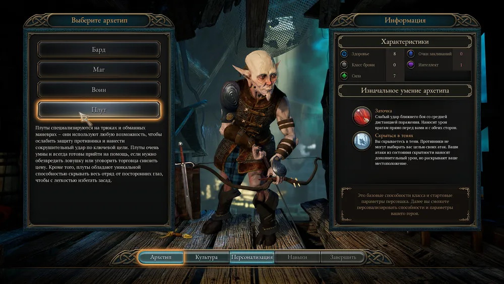 В игре представлено 5 классов: маг, воин, бард и плут доступны сразу, а клирик, как дуал-класс, будет доступен после выполнения побочного квеста.